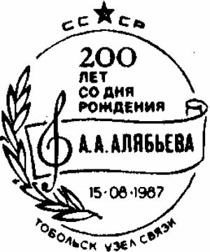 Тобольск Тюменской области. 200 лет со дня рождения Алябьева. Скрипичный ключ, лавровая ветвь.