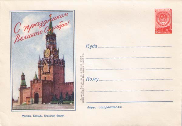 Спасская башня Кремля. Текст: «С праздником Великого Октября!».