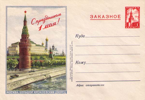 Заказное. Кремль. Водовзводная башня, Большой кремлевский дворец колокольня «Иван Великий», Успенский собор. Текст «С праздником 1 мая!».